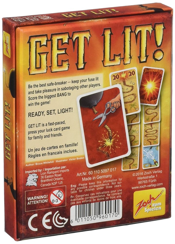 In Get Lit! the fuse is burning. Players take turns quickly adding more fuse cards to a continuously growing fuse until someone lets the bomb explode by playing one of his bomb cards, thereby earning him all of the fuse cards in play. He takes these cards, leaving only the starting match in play, then the fuse is lit once again.