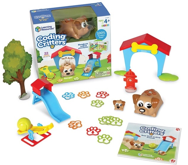 Your first coding friends! Meet Ranger and Zip, the Coding Critters! These playful puppy pets teach preschoolers early STEM concepts through coding and play! Code along with your new pets' playful storybook adventure! Design your own endless coding challenges with the interactive pet playset! Feed, pet, and take care of your new friends just like real pets in Play Mode! Pets connect nose to nose! Launch the ball to play fetch! Send Zip down the slide! Includes coding storybook.