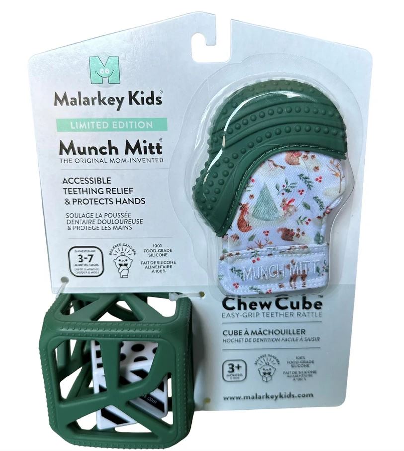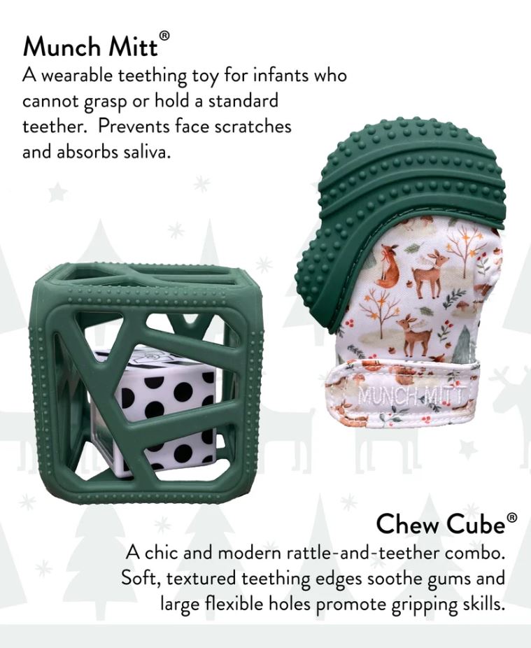 This holiday season, give the gift of comfort and cheer to the special little one in your life. Our Limited Edition Munch Mitt and Chew Cube Gift Pack is the perfect way to celebrate the magic of the season while providing practical, delightful, and safe teething solutions for your baby.