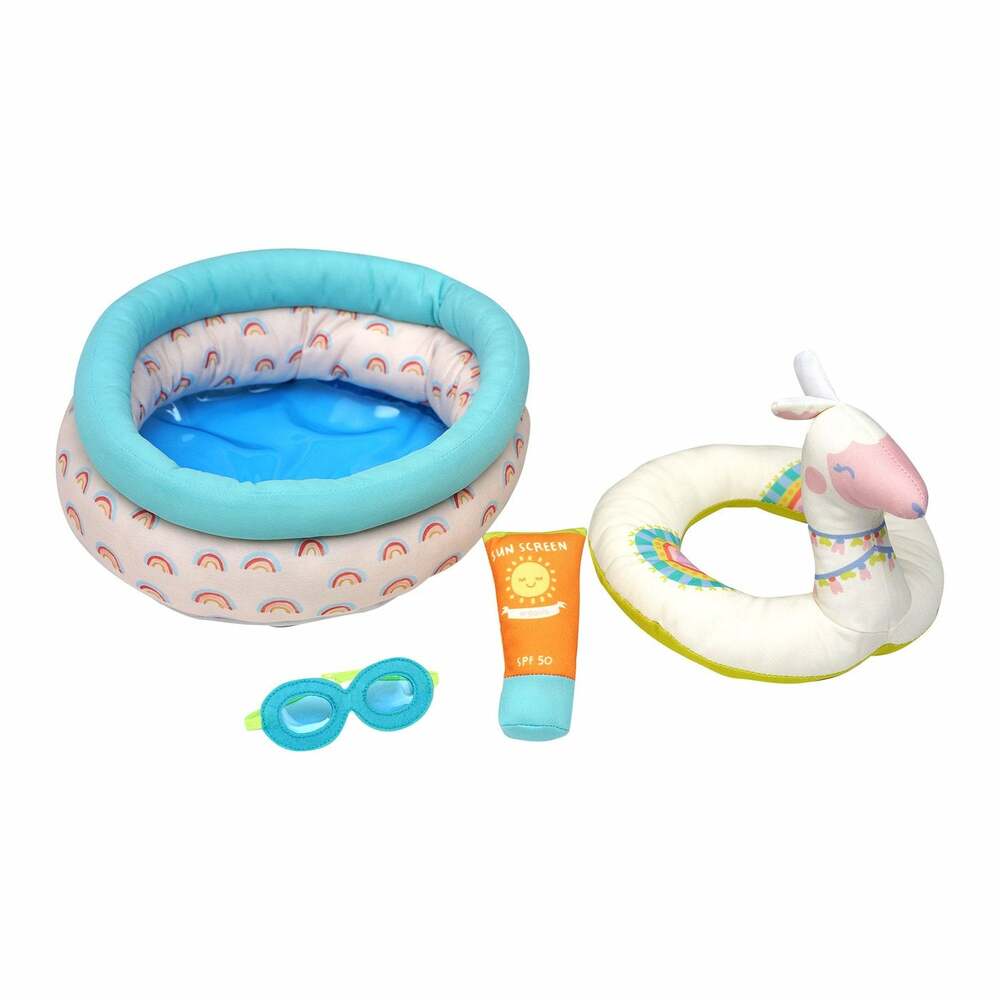 Splash into playtime with the Stella Collection Pool Party playset. This adorable four-piece pool-themed set includes a soft toy pool with blue soft-plastic bottom and a soft llama ring, soft-tube pretend organic 50 SPF sunscreen, and goggles! The perfect playset for Baby Stella and Wee Baby Stella fans alike, as all play accessories are compatible with both 15 inch and 12 inch soft dolls. Including the playful goggles that feature an elastic strap. These playful accessories encourage pool-time fun without the water! Doll play encourages motor skill development, nurturing role-play, and language skills as littles enjoy talking to their babies. The Stella Collection Pool Party set is not made for water play, but emulates pool-time-fun with a little help from the imagination.