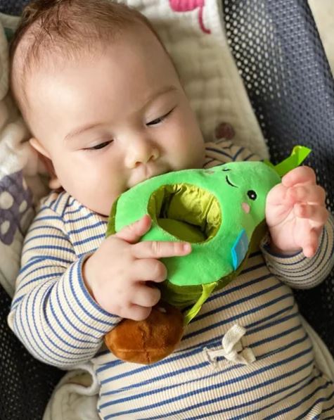 Fruity fun for little ones on the go! This avocado travel toy has a variety of soft textured fabrics, crinkle leaf, embedded chime and embroidered facial features. The pit features crinkle textures and a rattle too! Plus it's removable, but stays tethered to by silky-soft ribbon. It easily attaches to carriers, strollers, cribs and more with its textured plastic C-clip that doubles as a teether. Great for on-the-go play while encouraging motor development and cause and effect learning.