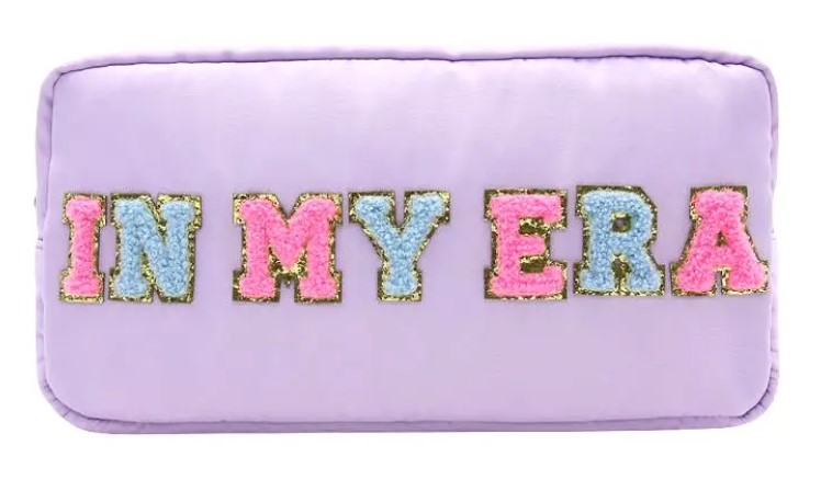 Hey Taylor Swift, we have a bag for you! Discover stylish on-the-go organization with an exclusive bag that tells everyone, "I'm IN MY ERA". This silky soft bag with soft pink and blue chenille letters with gold trim is giving Lavender Haze Bejeweled vibes. Fill it with dozens of friendship bracelets, cat figurines, red lipstick, guitar picks... you name it.