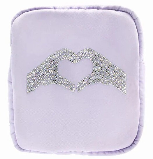 If you haven't caught sight of these, they are all the craze! Here's a compact nylon pouch with a glittering zipper. It's decked out with rhinestones that form the famous heart-shaped hands.