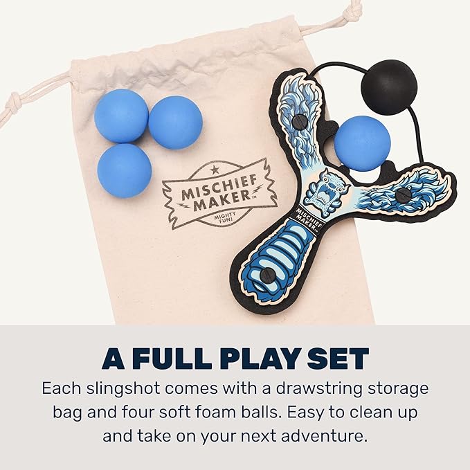 his Lil’ Monster Slingshot is ready for fun! The Mischief Maker LIl’ Monster Slingshot comes with everything you need to let loose and play. A soft foam ball is held in place, allowing you to run around and seek out an unsuspecting target. Hone in, take aim, pull back the foam hammer and let the ball fly. Every Mischief Maker is built to last and includes a handy storage bag. What are you waiting for, grab your Lil’ Monster slingshot and let the mischief begin.