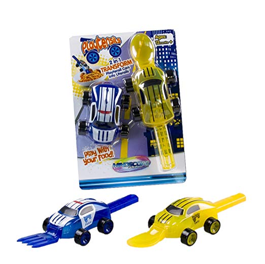 Playtensils Cars Easily Transform Into Utensils For Kids! Awesome 2-in-1 Cars: 1 Car Transforms from a Functioning Toy Car Into a Fork and The Other Car Into a Spoon! Fork/Spoon Tuck Away Into The Car! Cars come with working wheels.