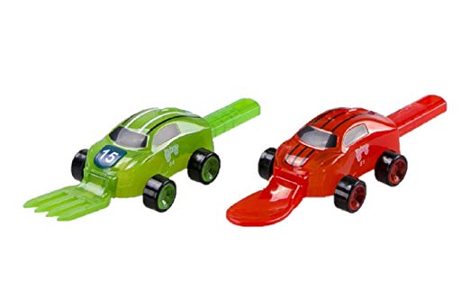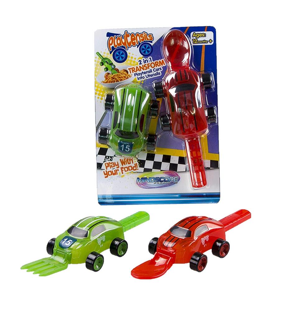 Playtensils Cars Easily Transform Into Utensils For Kids! Awesome 2-in-1 Cars: 1 Car Transforms from a Functioning Toy Car Into a Fork and The Other Car Into a Spoon! Fork/Spoon Tuck Away Into The Car! Cars come with working wheels.