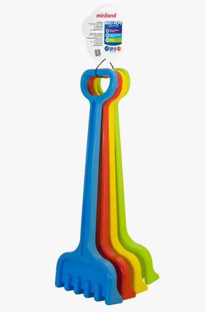 Kids love to play in the sand - at the beach or in the sandbox! They'll make good use of Miniland's Super Rakes in the backyard or on the playground. Miniland's brightly colored Super Rakes are made in Spain and perfectly sized for kids under 6! This set of 4 Super Rakes includes 1 each in yellow, blue, green and red. These rakes are large sized (50cm) with an extra long handle, and are made of durable plastic that will stand up to plenty of rough and tumble outdoor play. Resistant to cold temperatures, making them suitable for playing in sand OR snow!
