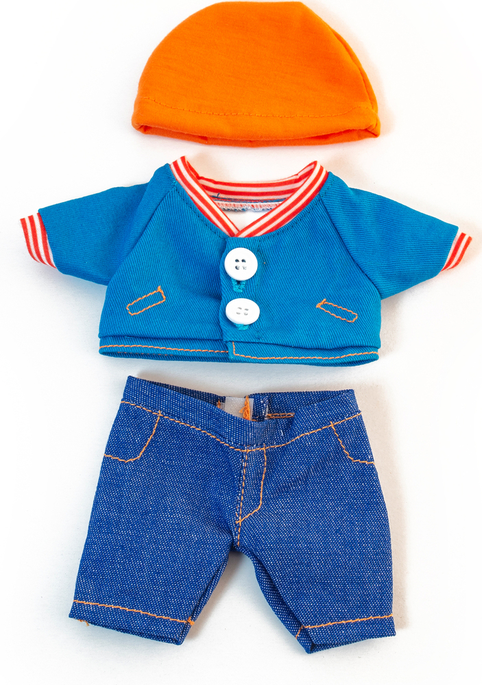 Mild weather jeans and jacket set to dress your doll for mild weather. Tool for teaching children about autonomy and learning how to dress themselves by practicing dressing a doll. Also great to teaching children how to dress for different types of weather.