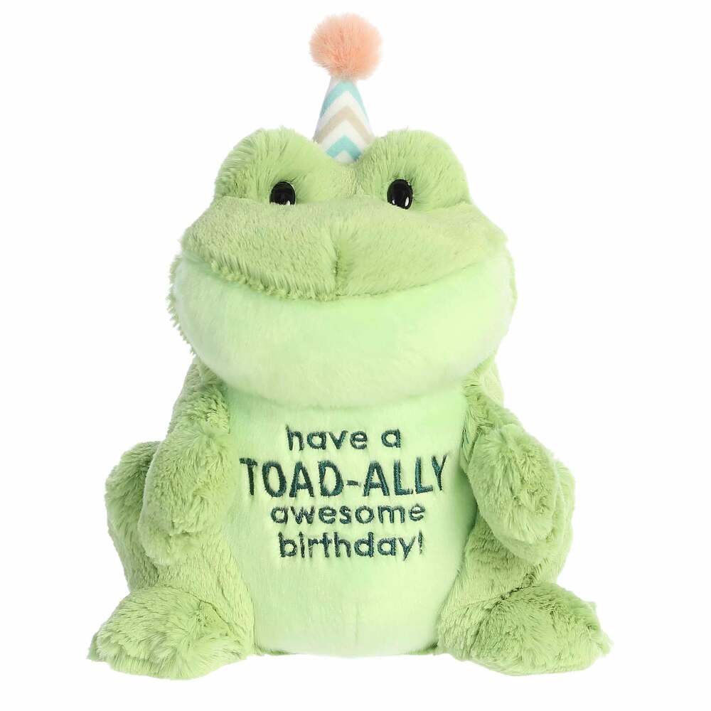 Make someone's day extra special with the Toad-ally Awesome Birthday plush from Aurora! Just Sayin’ is a collection filled with pun-forward plush characters each with a goofy expression that can be gifted for any occasion This adorable green frog features a festive birthday hat and an embroidered pun on its tummy that is sure to bring a smile to anyone's face.