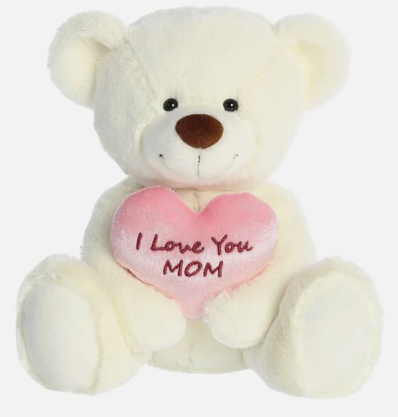 A whie bear with a big pink heart that says "I Love You Mom". Perfect for either Valentine's Day or Mother's day.