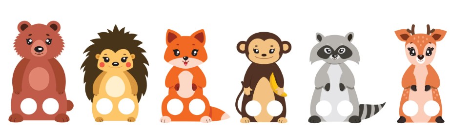 - 6 finger puppet figures: a deer, raccoon, porcupine, monkey, fox and bear
