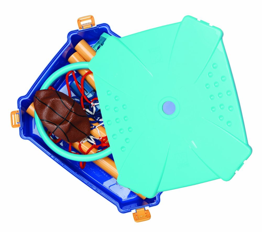 Basketball Set in all surface base, carry case Durable Steel tube construction. The height adjustable pole and midsized basketball make it perfect for players up to 8 years of age. The all surface stand allows play on virtually any surface such as grass, decking, concrete - even sand. Simply fill the base with water or sand for stability. Breakaway hoop. All components can pack inside the case. Easy to carry, easy to store.