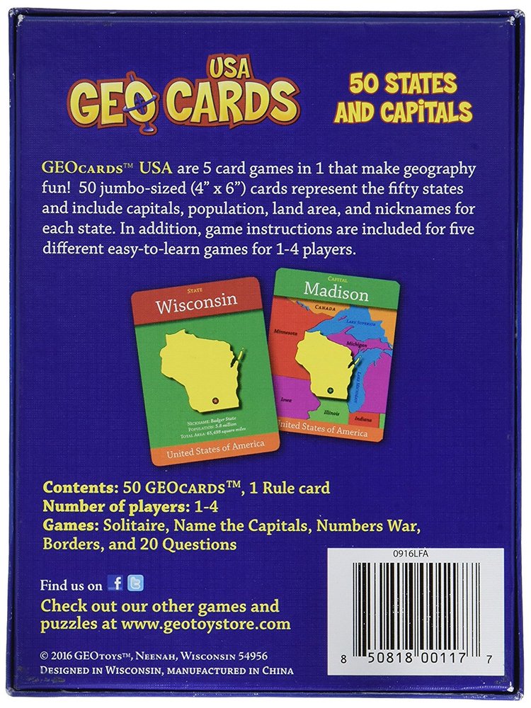 50 Jumbo Sized Cards (4.5" x 6.0") with states on one side and capitals on the other. GeoCards also have population, nickname and land area information for each state, and rules for five different games for 1-4 players.