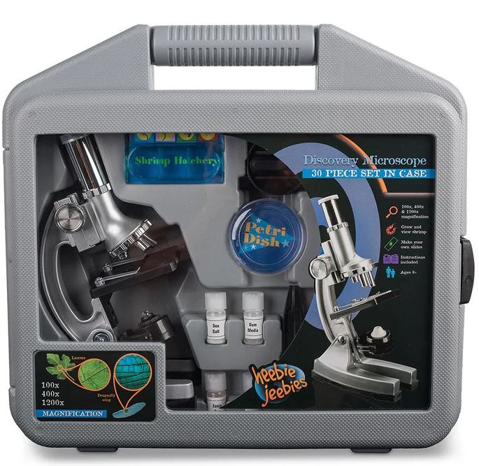 This stylish microscope comes with a sturdy carry case and everything you need to start your discovery of the microscopic world! This 28 piece kit Includes three lenses, seven blank slides, slide covers, petri dish, brine, a shrimp hatchery and more!