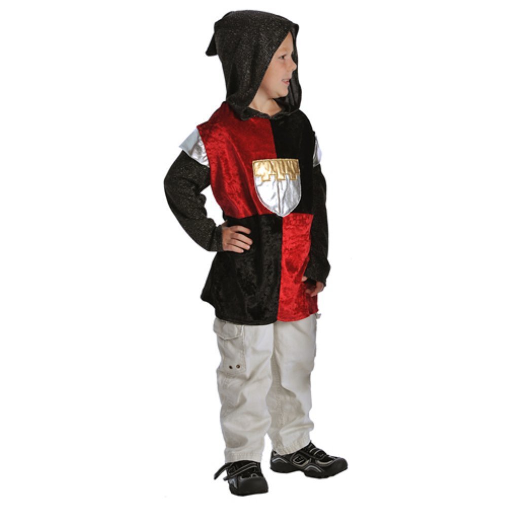 This one piece design is made for a Knight on the go. Just slip this soft, comfortable shirt on and you are back in the dark ages. It has a hood and sleeves made from a black, soft fabric with a hint of metallic to give it the look of chain mail. The front is made of black and red crushed velvet with a royal crest. Fits 3-5 years.
