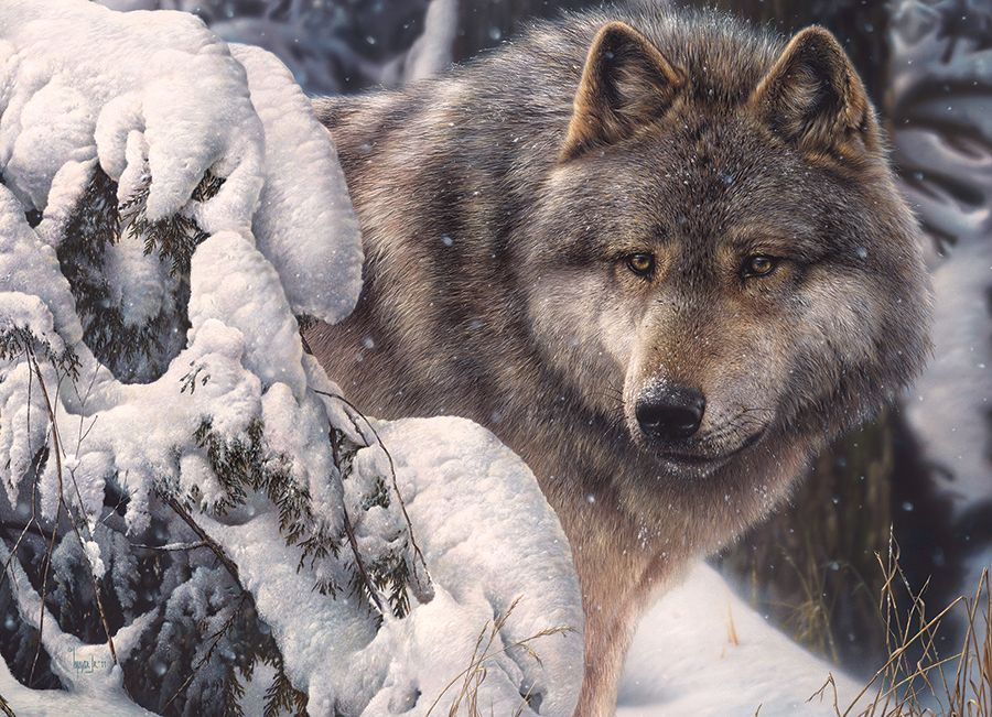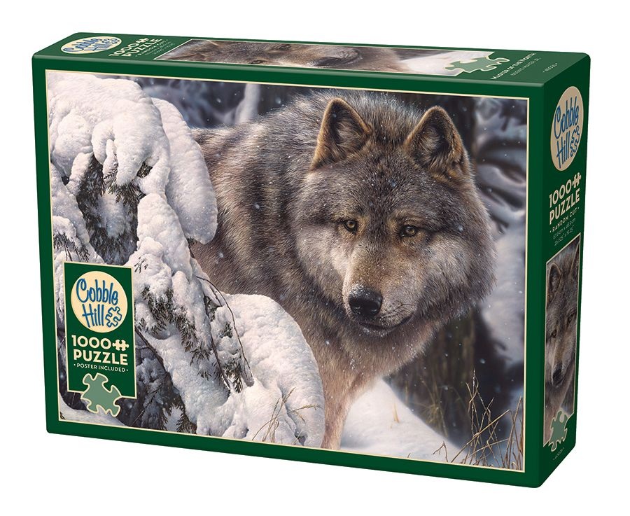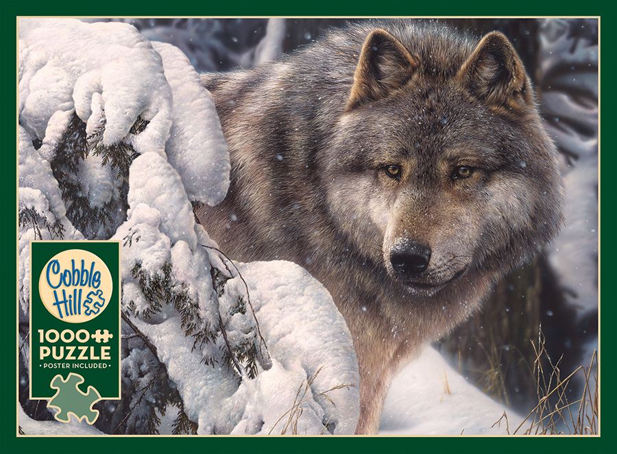 This wolf is the Master of the North and his keen eyes have spied something in the distance of the snow covered forest. This wolf does not plan to starve this winter. Difficult parts of this 1000 piece puzzle may be the darker out of focus background, but the beauty of the puzzle is in the detail of the fur!