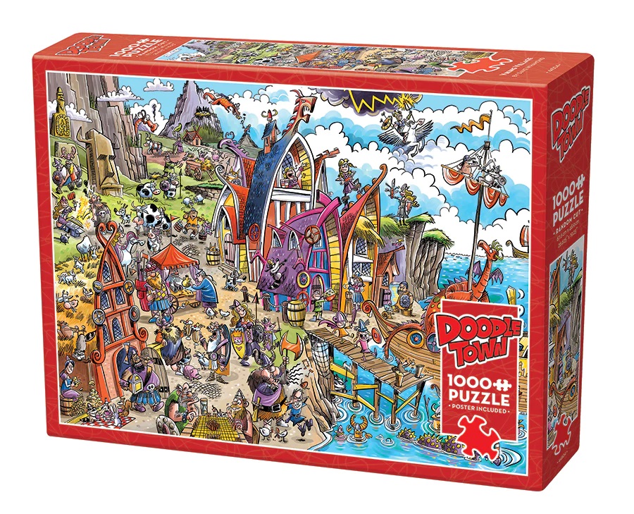 The Viking Village just received a new shipment of chaos! Come have fun exploring the island, playing chess, having tea parties with the wildlife, swimming with the sea monster, fend off some dragons, drink ale, fly away on Pegasus and whatever other ridiculous thing you can think of that Vikings do...but do they really? They do in Doodletown! Join the excitement and have some laughs along the way in this 1000 piece cartoon puzzle.