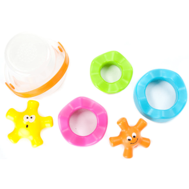 Stack them, spin them, and set them adrift! Two star-shaped buddies and three colorful, wavy rings are waiting for little ones to dump them out of their pail and into hours of creative exploration. Kids can stack them from big to small or small to big - But that's only the start. Try stacking rings on rings and stars on stars. Try balancing them precariously or see if you can discover a whole new creative configuration. - There's no wrong way to play! Then - SPLASH! - Add these pals to the tub and the fun flows rapidly into an adventure. They float, they spin, and when kids fill up the pail, they can lift it high to see the water sprinkle like rain! Friendly, colorful, and beautifully open-ended - Fun overflows the moment kids befriend the Pail Pals.