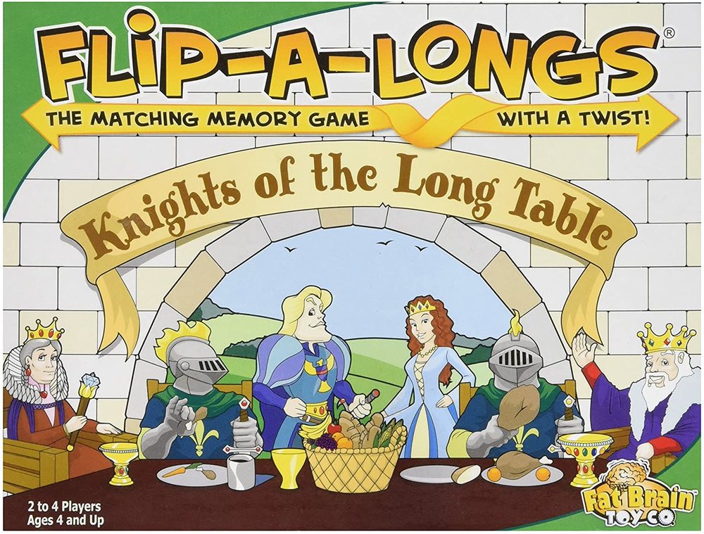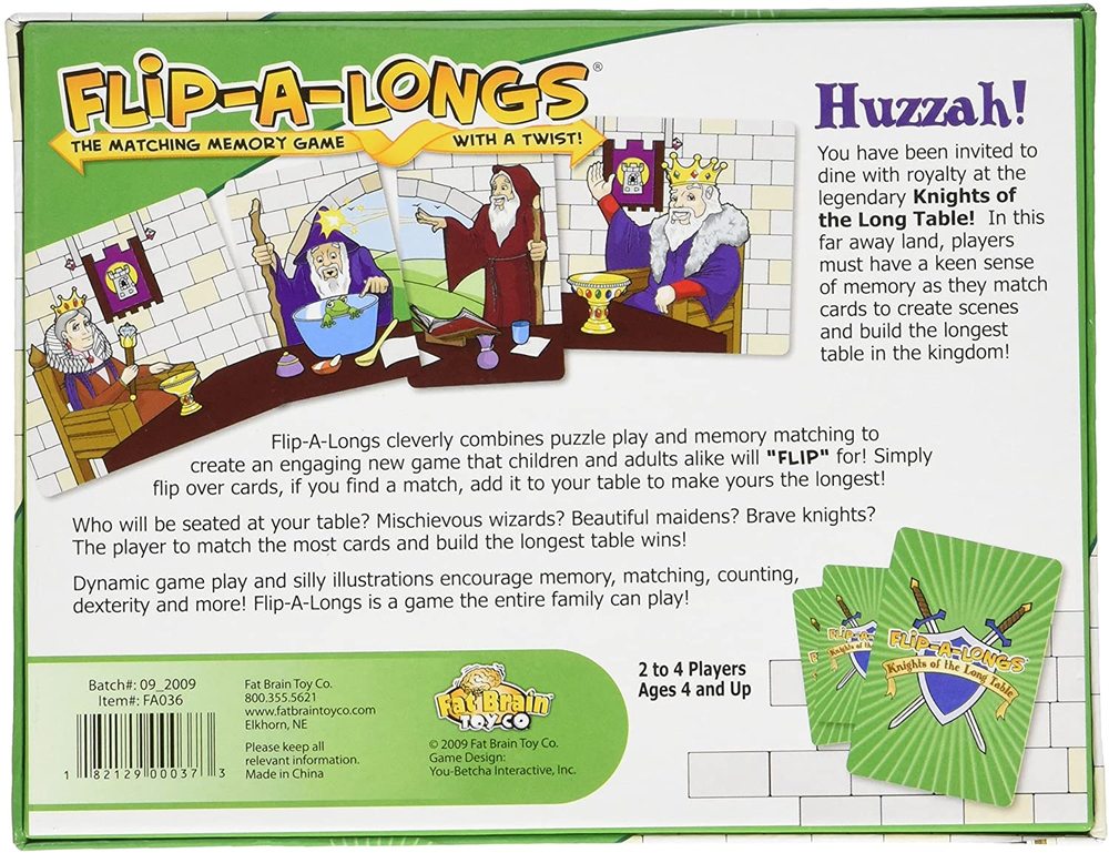 You have been invited to dine with royalty at the legendary Knights of the Long Table! In this far away land, players must have a keen sense of memory as they match cards to create scenes and build the longest table in the kingdom! Flip-A-Longs cleverly combines puzzle play and memory matching to create an engaging new game that children and adults alike will "flip" for! Simply flip over cards, if you find a match, add it to your table to make yours the longest! Who will be seated at your table? Mischievous wizards? Beautiful maidens? Brave knights? The player to match the most cards and build the longest table wins! Dynamic game play and silly illustrations encourage memory, matching, counting, dexterity and more! Flip-A-Longs is a game the entire family can play!