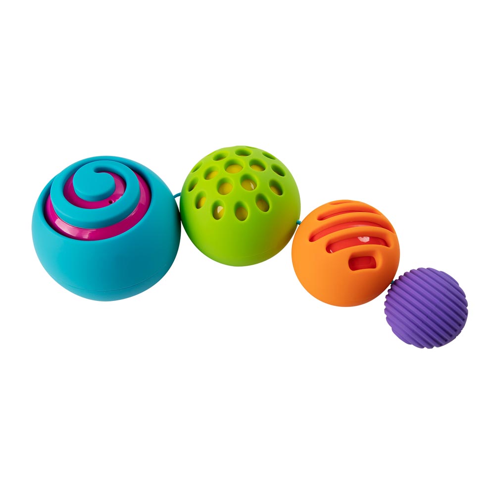 Each colorful ball is uniquely textured with fascinating dots, lines, and swirls. Meanwhile, short, safe tethers keep them all connected in a wonderfully wobbly row.