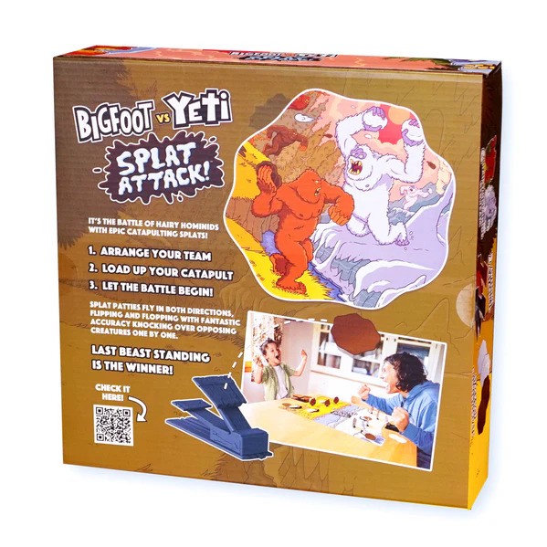 It's the battle of hairy hominids with epic catapulting splats! All you have to do is arrange your team, load up your catapult, and let the battle begin! Splat patties fly in both directions flipping and flopping with fantastic accuracy knocking over opposing creatures one by one. Join in the fun as the Yeti or Bigfoot - either way, you're going to have a gigantically good game night!