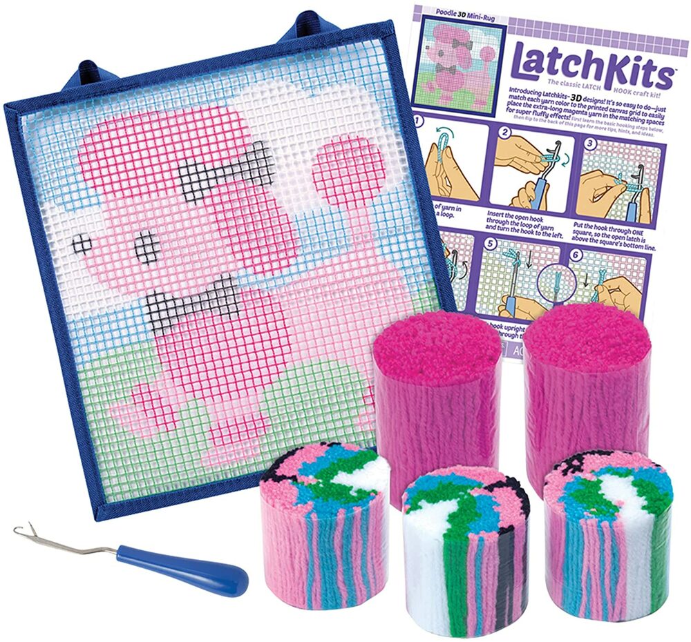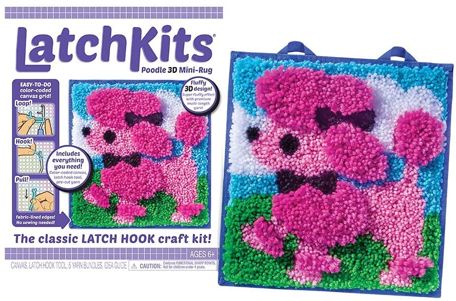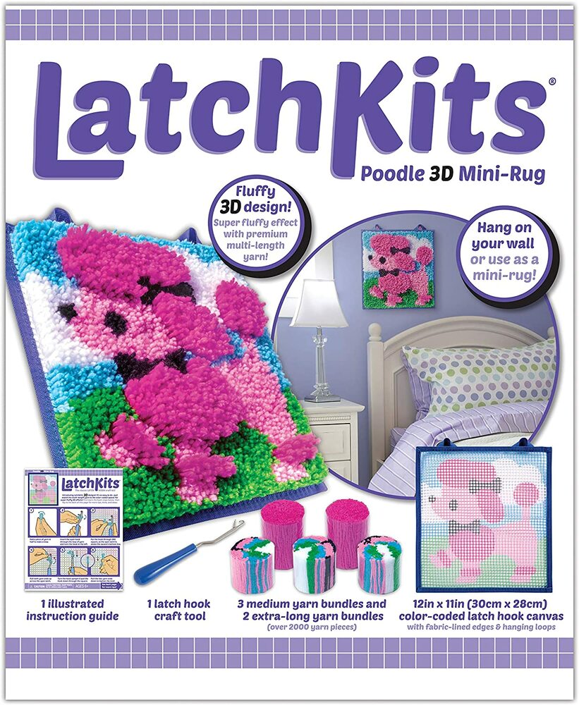 The classic latch hook craft kit is back! Latchkits are a fun and easy-to-learn craft; just loop, hook, and pull! Everything you need is included: the handy latch hook tool, pre-cut yarn and color-coded, easy-to-follow canvas make getting started on your project a snap. The sturdy canvas features fabric-lined edges and hanging loops to create your very own soft and fuzzy Poodle design that's ready to hang on your wall or use as a mini-rug. It's a great anytime project!