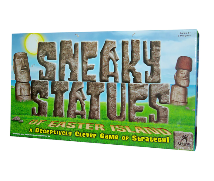 In this game of sneaky strategy, players take turns moving eight "stone" Moai statues. Where do they move? How do they end up in a straight line,? That's up to you! Be the first to outwit your rival and arrange your four statues in a straight line and win. But wait! The statues are always moved in numerical order, so your rival knows which statue you will move next. The question is...so they know where it will go? Be careful, you just may unlock the secrets of Easter Island while you play!