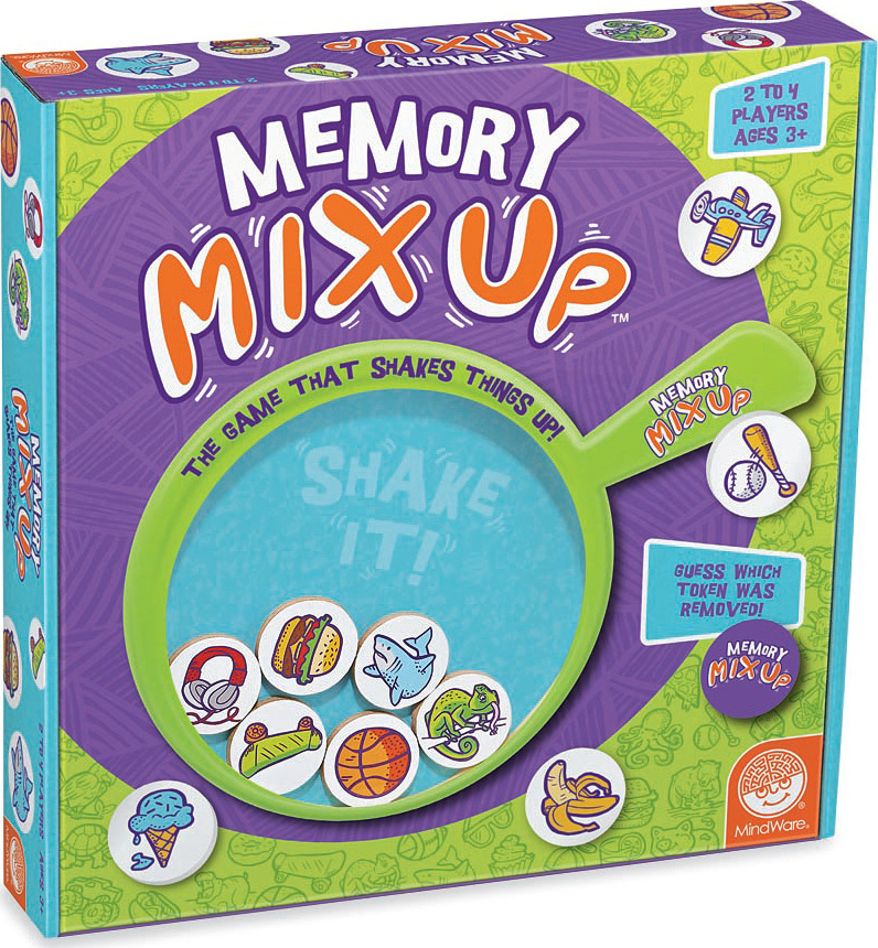 This fast-paced family game will test your memory and rattle your brain! Quickly memorize the picture tokens loaded in your shaker paddle. Then turn over the paddle, give it a shake to mix things up and secretly remove one token through the handle's exit slot. Then flip the shaker back over and race to identify which token is missing!