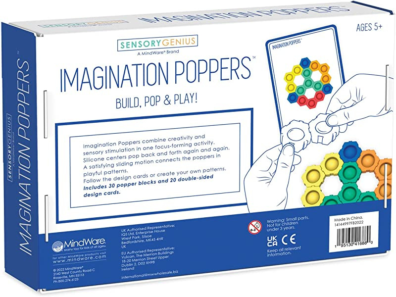 Slide these pieces into place to build your own sensory popper! Follow one of the 40 included design builds or let your imagination run wild on your own creation, then start all over again for hours of sensory enjoyment. Makes a great gift for students and anyone else who could use a hefty dose of creativity, focus and tactile fun!