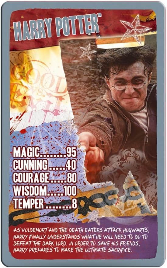 As Voldemort and the Death Eaters attack Hogwarts, Harry finally understands what he will need to do to defeat the Dark Lord, but does he have the cunning, courage and wisdom to fulfil the prophecy? In order to save his friends, Harry prepares to make the ultimate sacrifice. Join your favorite characters in this new adventure against the evil powers with Harry Potter and the Deathly Hallows Part 2 Top Trumps!