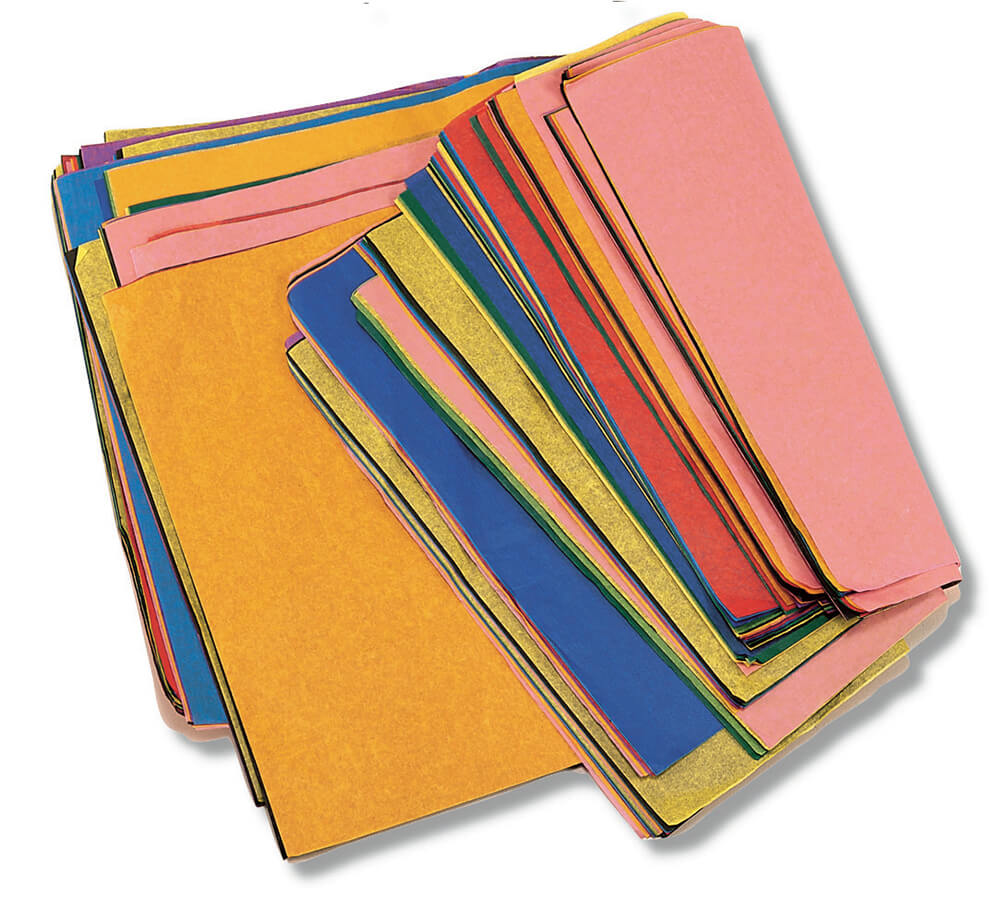 This pack features small pieces of tissue paper in a variety of colors and sizes. Each 1 lb. package contains a range of colors suitable for cutting and gluing. Recyclable.