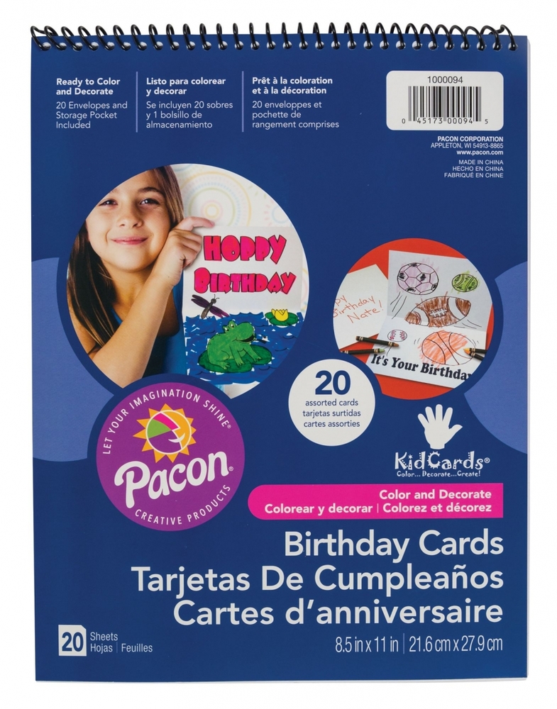 Pacon® KidCards® are a fun way for kids to wish their friends and family a happy birthday. The spiral bound pad conveniently includes a storage pocket, 20 envelopes and 20 pre-printed assorted birthday cards. The cards are made from quality card stock, and are ready to color and decorate with markers, crayons, colored pencils and even paints! These cards also accept glue, so you can add special accents like glitter, gems, feathers, tissue paper, photos, yarn and other embellishments. Have fun creating these personalized greeting cards... there really are no limits!