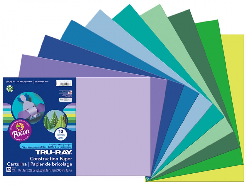 Heavyweight 100% vat-dyed sulphite with longer, stronger fibers. Tru-Ray® Construction Paper is tough enough to take scoring, folding and curling without cracking and tearing. Its superior fade-resistance keeps projects brighter and fresher longer. Cool Assorted package contains 10 colors: Blue, Brilliant Lime, Dark Green, Festive Green, Light Green, Lilac, Royal Blue, Sky Blue, Turquoise and Violet. Acid free for less fade. 50% recycled fiber content and recyclable.