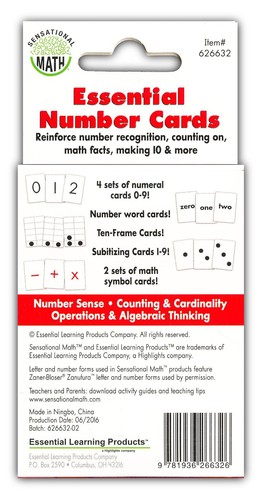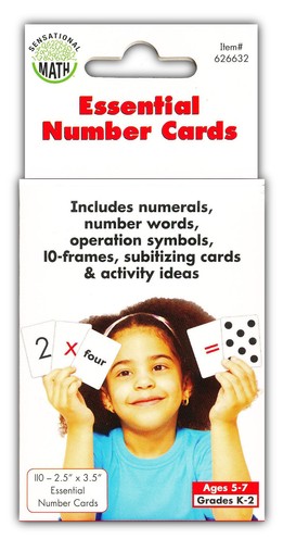 Help make practicing numbers 0-10 fun with Essential Number Cards from Sensational Math. Use these 2.5" x 3.5" cards to reinforce number recognition, counting on, math facts, making 10, and comparing numbers. This collection includes numeral cards 0-9, ten-frame cards 1-10, subitizing cards 1-9, math symbols and more. 110 cards total. Grades K-2, Ages 5-7.