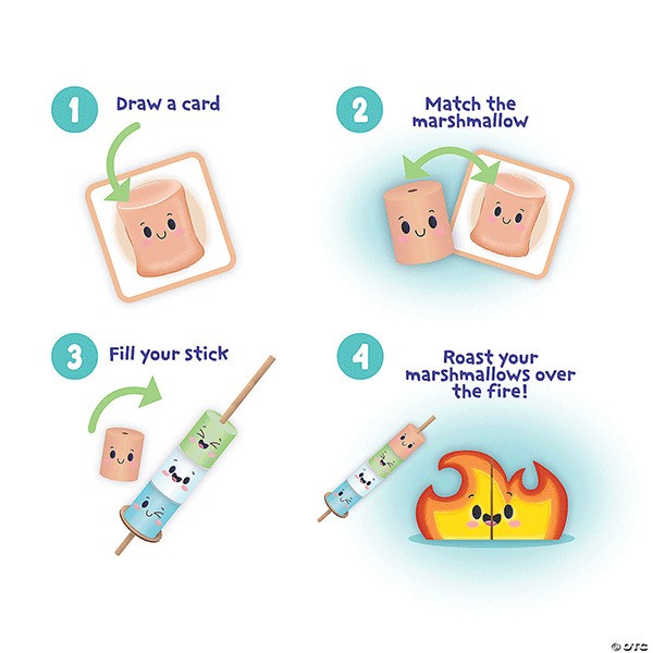 In this game, players grab a marshmallow roasting stick and take turns drawing cards to add matching marshmallows to their sticks. The goal is to fill up all the roasting sticks! Once all of the sticks are full, players can celebrate by “roasting” their marshmallows over a pretend campfire and singing campfire songs.