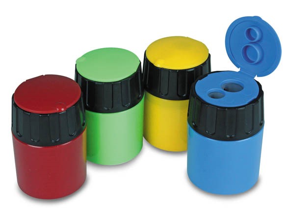 2-Hole sharpener for standard and primary pencils. High quality blades made in Germany. Secure screw top with lid with bucket design for pencil shavings.