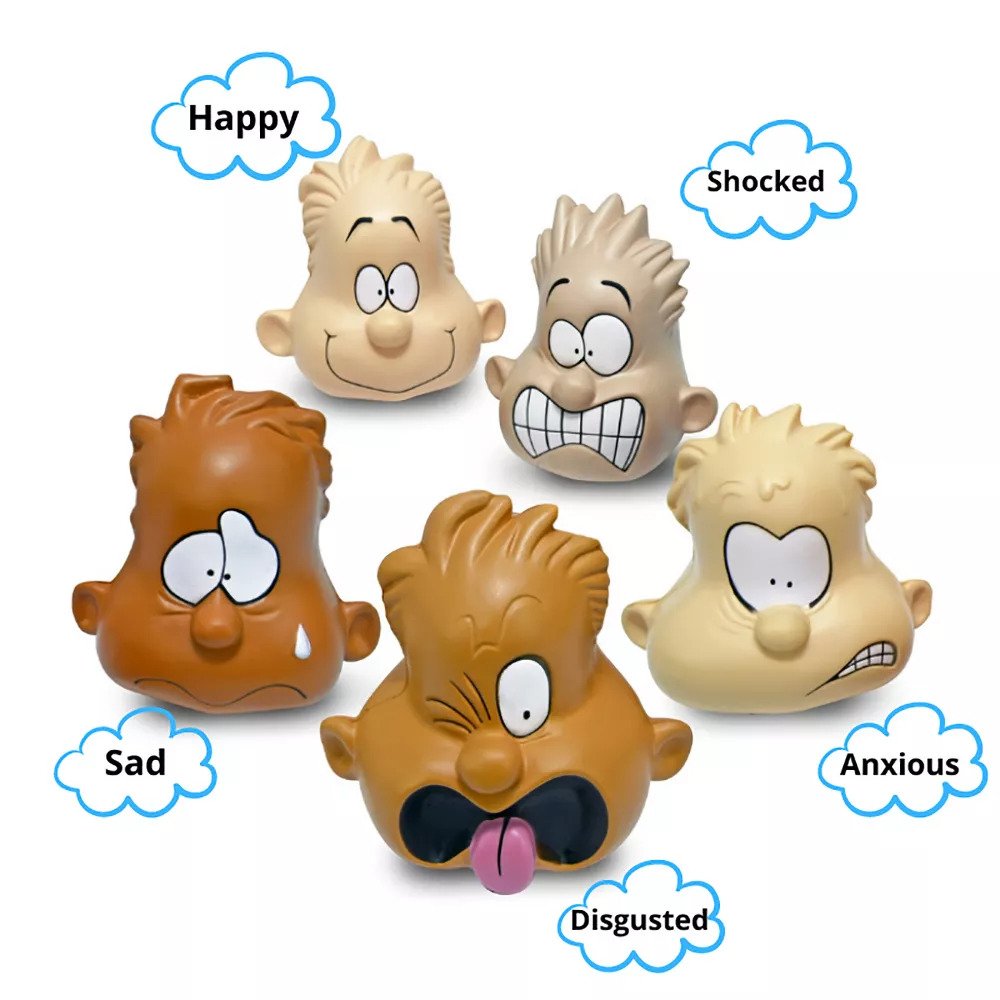 Five fun faces to squish! Feeling Heads relieve stress and open up communication to talk about feelings. Children and adults alike love to play with these squeezable faces! Toss them around, discussing each feeling.