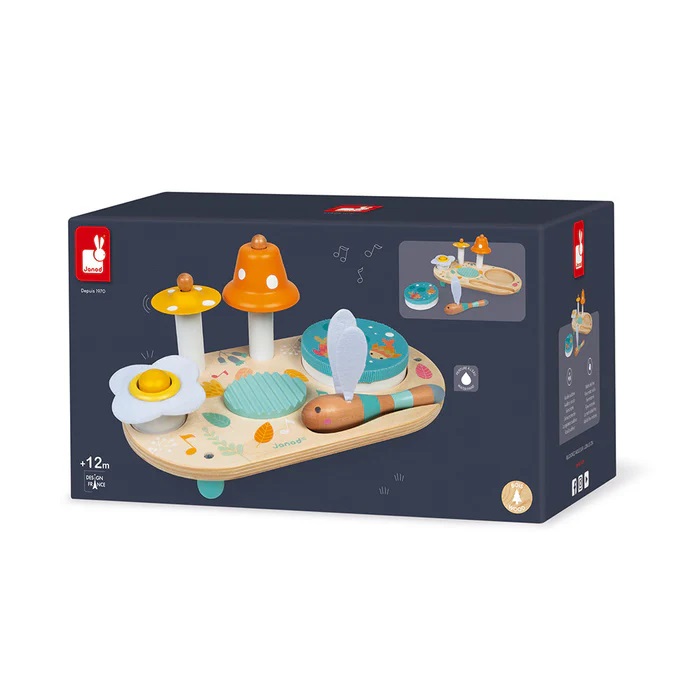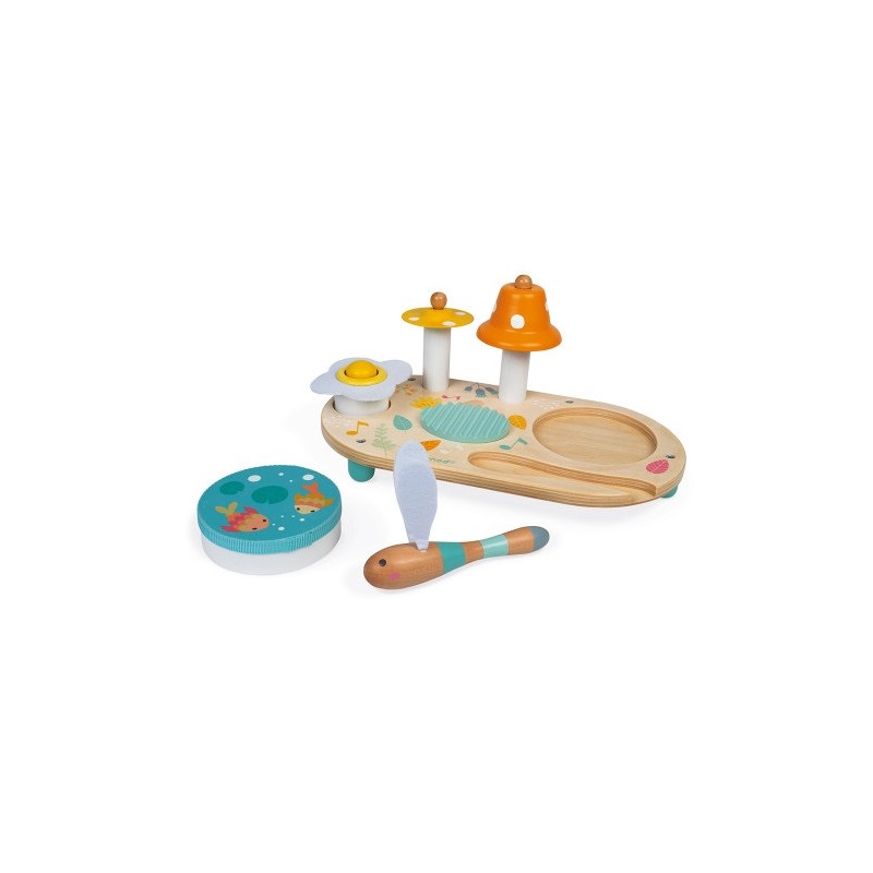 Welcome to nature, for a bucolic stroll among dragonflies and country flowers! On the programme for baby's journey, musical discovery with this pretty Pure table with soft, romantic colours and illustrations! From the age of 1, children will be able to learn about different sounds independently thanks to this beautiful sound-awakening game. The musical table consists of a yellow mushroom cymbal, an orange bell with white spots, a wooden scraper, a daisy-like squeaker and a removable tambourine. The tambourine represents a beautiful pond where the fish are making bubbles under the water lilies. To make it ring out, children can use this funny stick in the shape of a dragonfly with its soft white felt wings! With this wooden toy, baby will learn about music at his/her own pace!