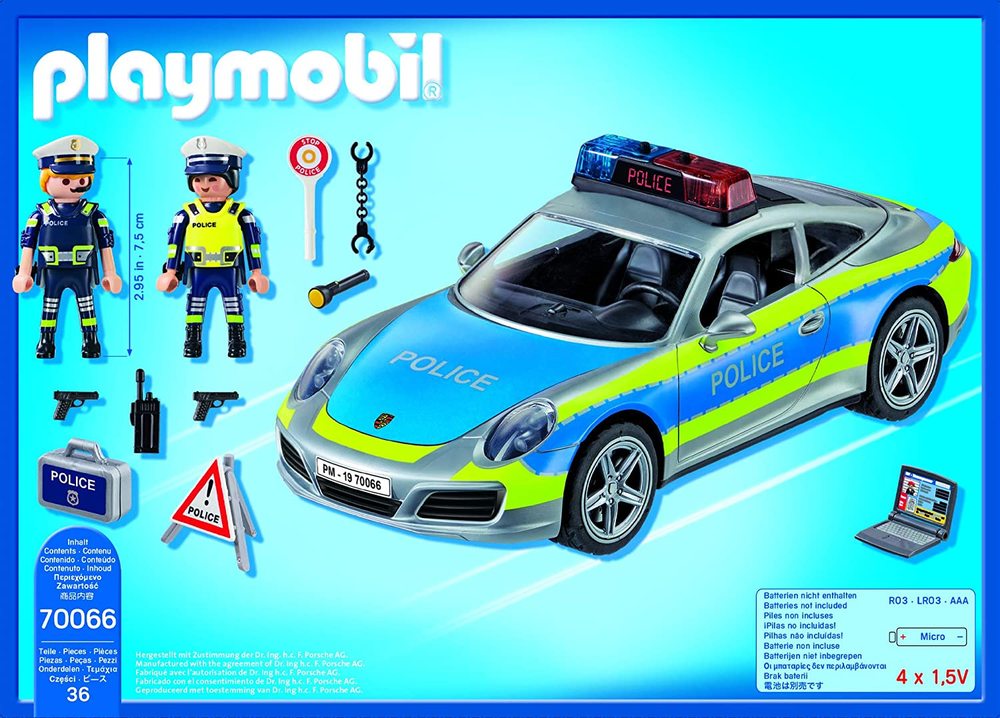 - Set includes two police officers, Porsche 911 Carrera 4S car, briefcase, and many other accessories.