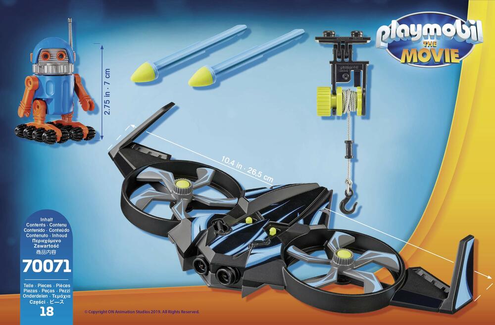 In search of her younger brother Charlie in the magical and colourful PLAYMOBIL universe, Marla teams up with many strange and heroic companions. One of them is the loyal robot Robotitron. From the first second Robotitron has a crush on Marla and wants to help her find Charlie again. If the friends are in danger, Robotitron is immediately coming with his practical drone. They all hold on to the rope and fly away in no time. PLAYMOBIL: The Movie is the first animated film inspired by the imaginative world of PLAYMOBIL and takes the audience on an epic, funny and unforgettable adventure. Matching the cinema launch, there are nine cool game sets around the PLAYMOBIL film.