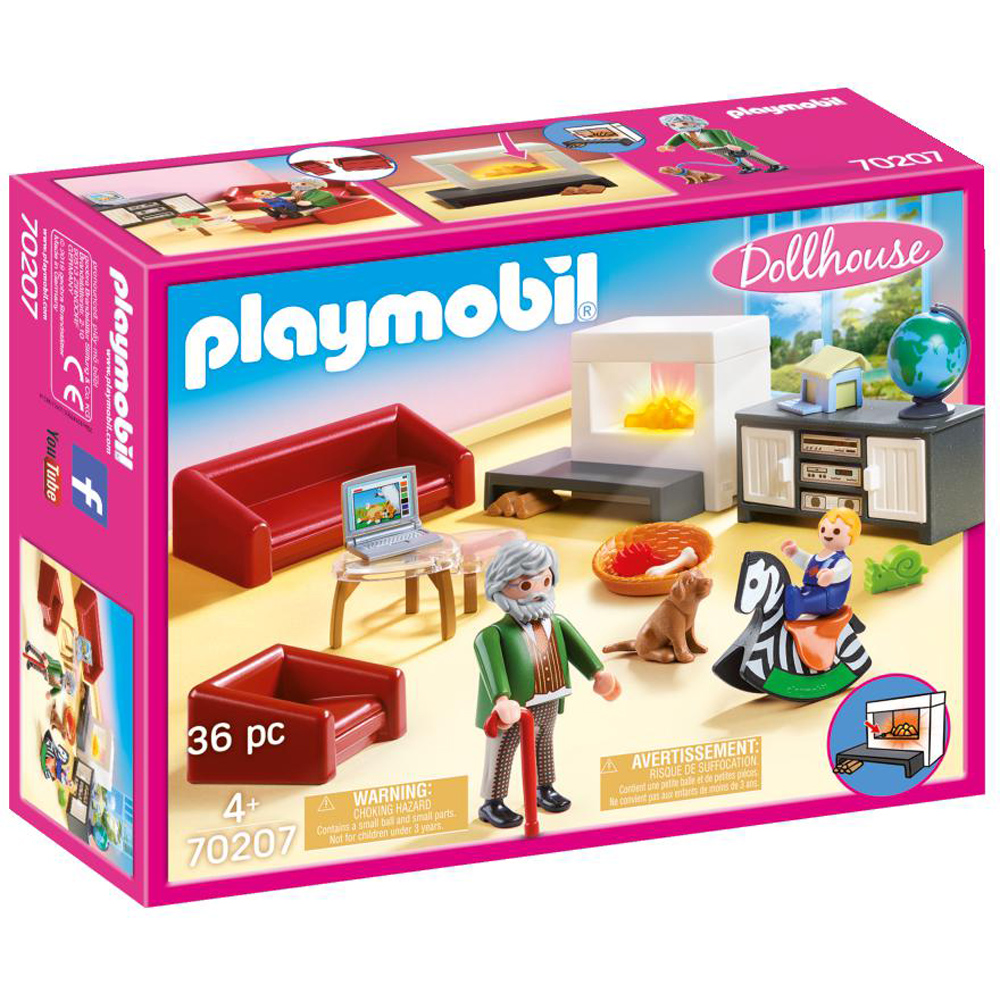 Spend some quality time with Grandpa in the Comfortable Living Room. As he sits by the illuminated fireplace, the child rocks on the horse nearby, and the dog snoozes in the nearby dog bed. If you have overnight guests, the sofa and armchair can easily be folded out for a temporary bed. Set includes two figures, stand, two side tables, armchair, couch, illuminating fireplace, dog, basket, and other accessories. Combine this set with the Large Dollhouse (70205 – sold separately) for added fun.