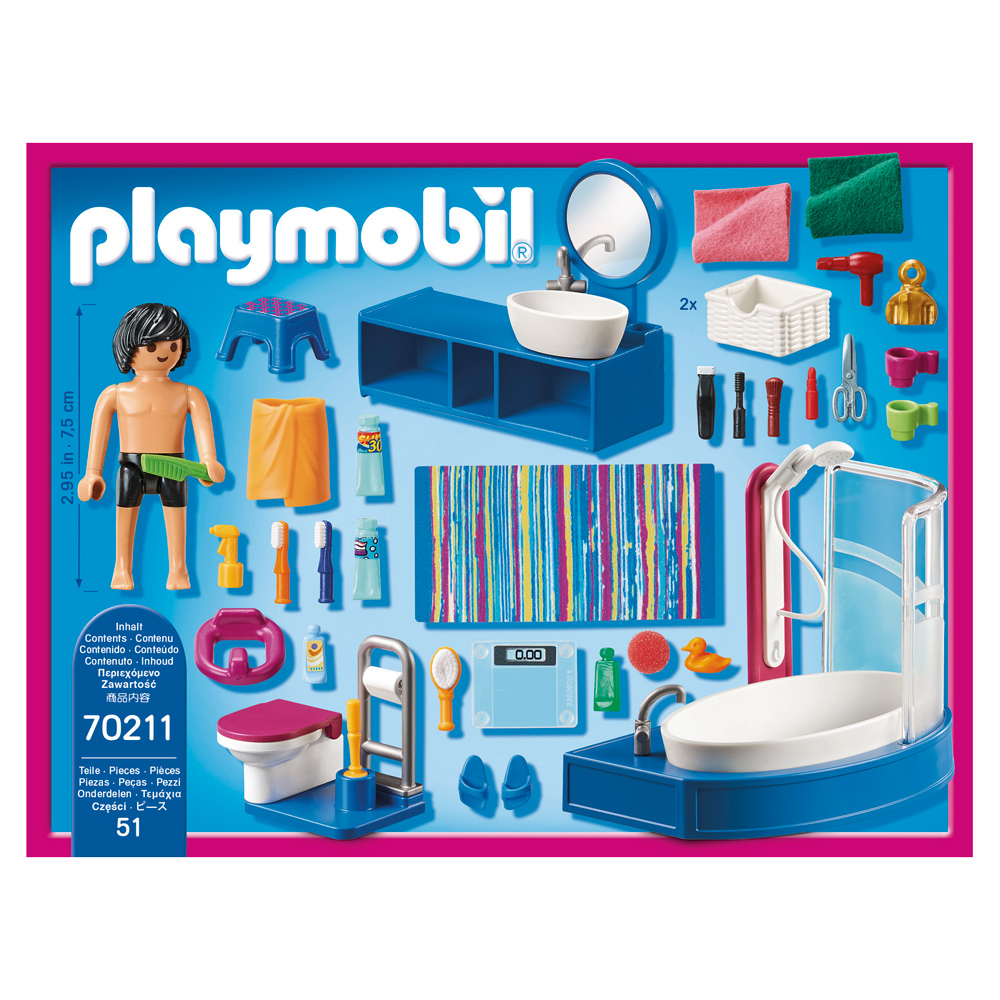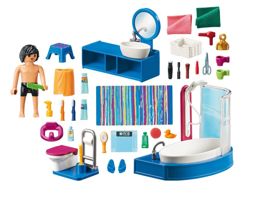 Get ready for the day in the Bathroom with Tub. Whether you want a shower or bath, you will find it in this bathroom. It even includes towels and a rubber duck for bath time fun. You can stand at the mirror to dry and style your hair. Little ones can easily reach the sink with the included step stool to brush their teeth. The baskets underneath the sink offer plenty of storage space for all your bathroom necessities. Set includes one figure, large sink with mirror and storage, toilet, bathtub, oval rug, stool, hairdryer, toothbrush, toothpaste, plant, and other accessories. Combine this set with the Large Dollhouse (70205 – sold separately) for added fun.