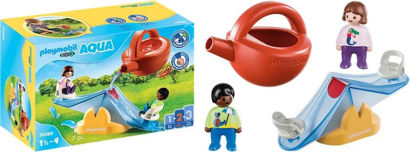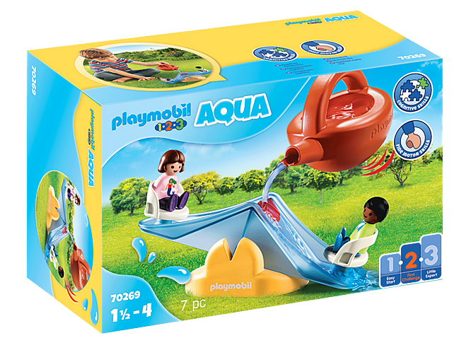 Rocker, rocker - hooray! The figures move up and down by pouring water with the watering can onto the red dot. Can be combined with other Playmobil Aqua sets (sold separately).