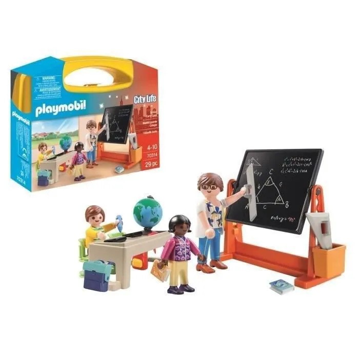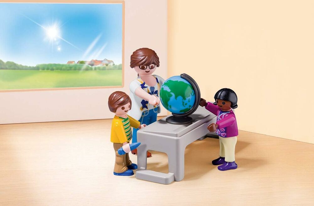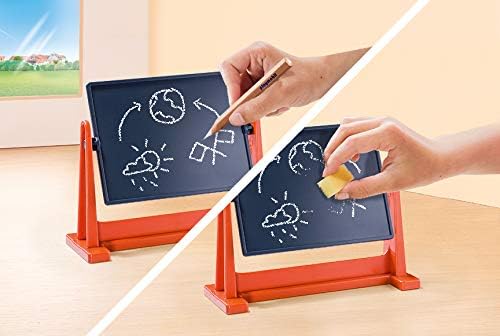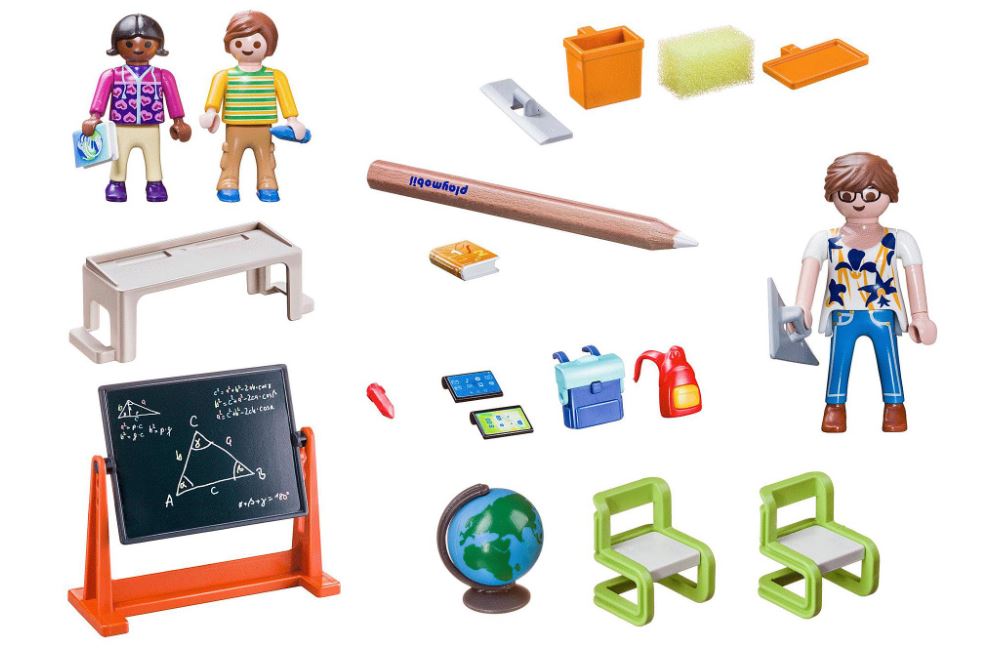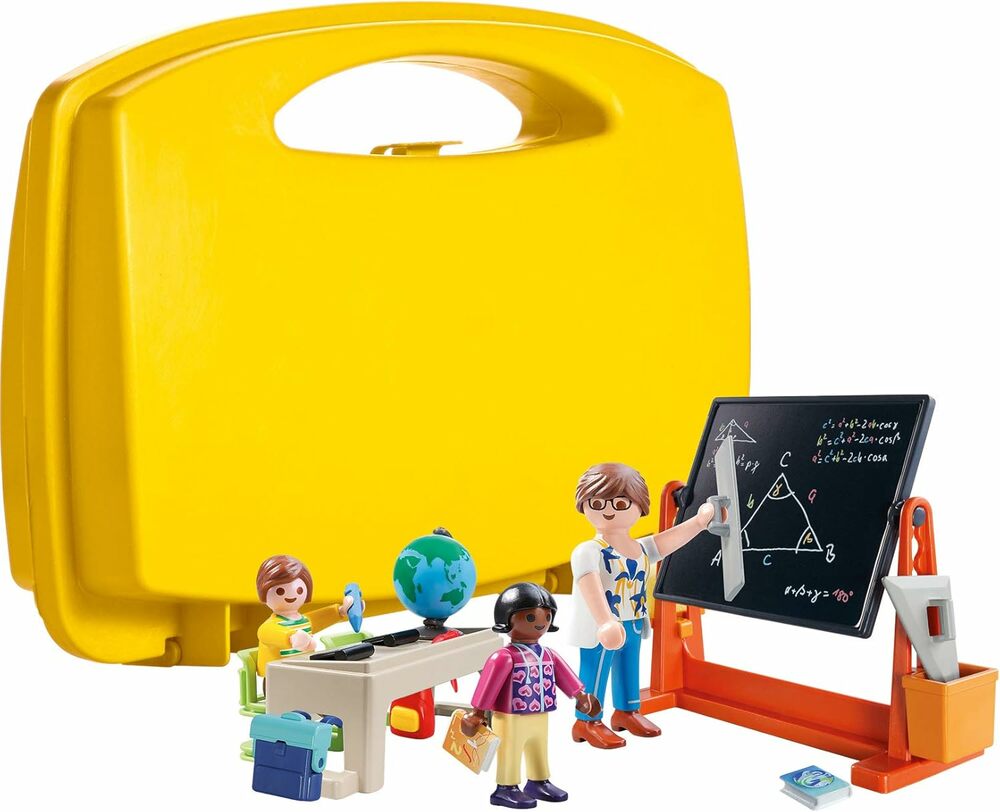 Class is in session with the School Carry Case. Sit down at the desk to get ready for the lesson of the day. Make sure to pay close attention as the teacher explains the math problem on the chalkboard. Use the included pencil to write lessons on the board, and then use the sponge with water to clean it off after the lesson is finished. When playtime is over, simply store the pieces inside the case for next time! Set includes three figures, chalkboard, desk, chairs, books, and other accessories.