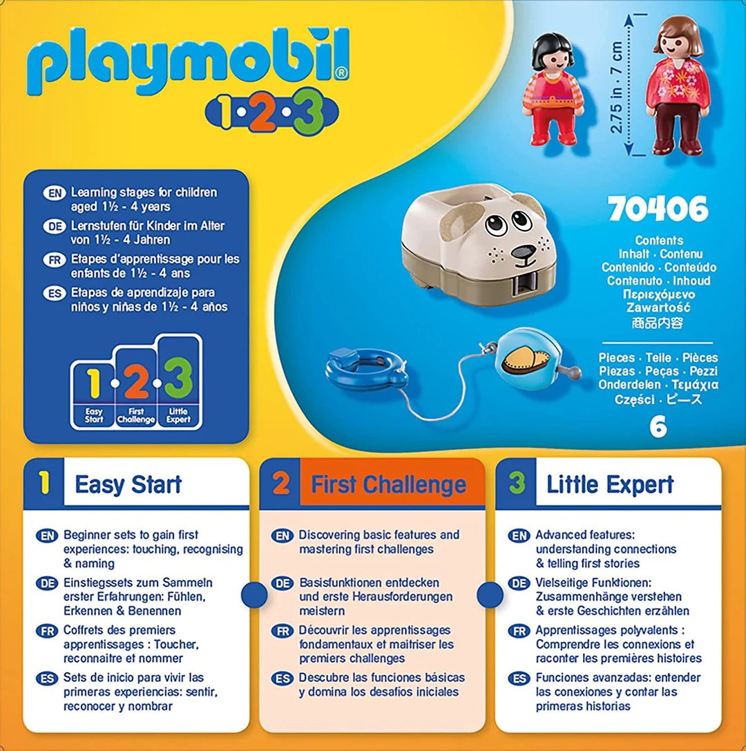 Take the dog by the leash or let the figure pull the dog along. Feed the dog with the bone or let the dog bring the slipper.