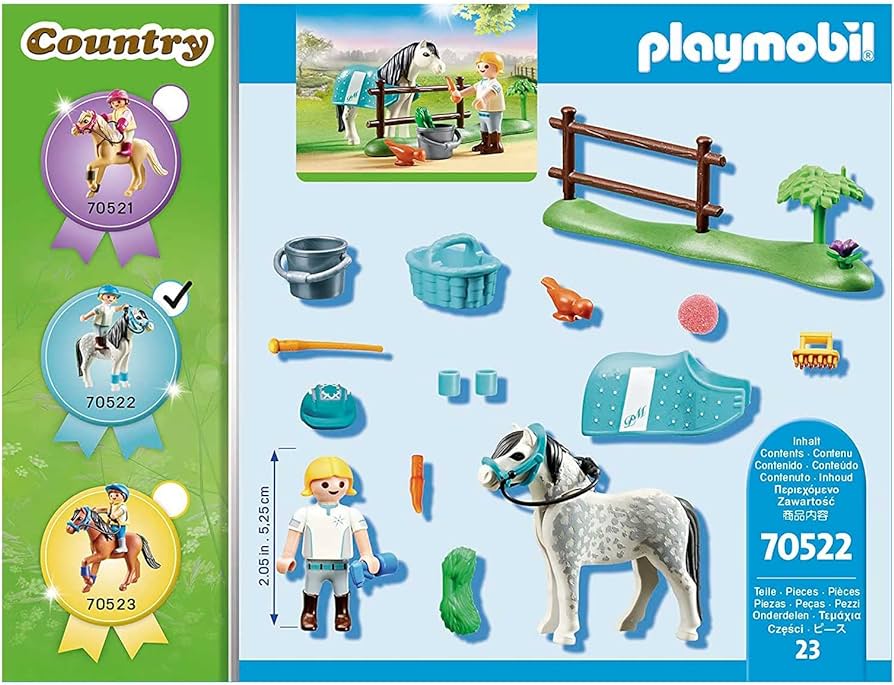 - Accessories: 1 fence, 1 bucket, 1 basket,1 sponge, 1 curry comb, 1 riding crop, 2 gaiters, 1 saddle blanket, 1 spray bottle, 1 carrot, 1 tuft of grass