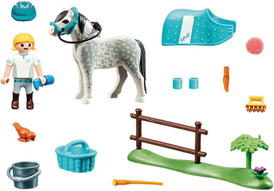 If it were up to her, the little girl would spend every day with her pony. Today the weather is glorious and the two of them are going for a long ride. Afterwards, of course, she has to groom the horse. But brushing, grooming and checking hooves also give the little horse fan great pleasure. She lovingly brushes her pony's coat and puts the horse blanket on him. Time always flies by. The playset contains a girl, a pony, riding cap, horse blanket, bag, bucket, bridle, brush and many other loving extras. Riding blanket and accessories are colour coordinated.