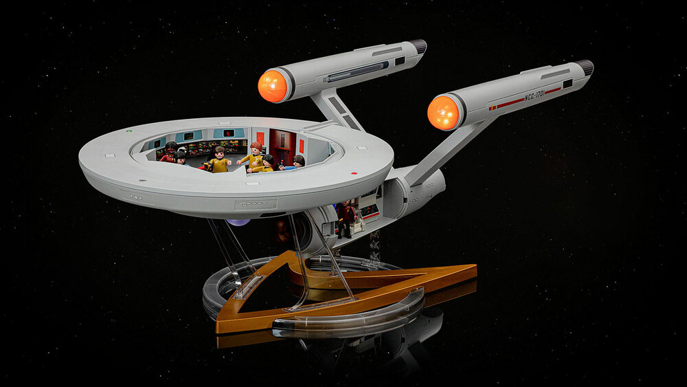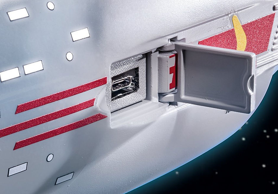 Who doesn't know the legendary Starship Enterprise? Space, the final frontier - in the 23rd century, Captain James T. Kirk and his crew embark on their mission to foreign galaxies. For five years, the Enterprise is on its way, many light years away from Earth, to explore strange new worlds, to seek out new life and new civilizations, to boldly go where no one has gone. Now the legendary starship U.S.S. Enterprise NCC-1701 is available in the PLAYMOBIL version as an exclusive collector's item. Of course, including the famous crew with Captain Kirk, Chekov, Dr. McCoy, Scotty, Sulu, Uhura and Spock in Starfleet uniform. The PLAYMOBIL Enterprise has a bridge with rotating chair for Captain Kirk, workstations for all crew members, cell phone holder and storage compartment for phasers, communicator and other equipment. In the hull is the engine room with two stand-up workstations. To activate the light and sound electronics, the dilithium core must be inserted into the container and placed in the engine room. Power can be supplied via batteries or USB connection. When switched on, Captain Kirk personally announces greetings. The buttons on the center console on the bridge can be used to control various light and sound effects such as the warp drive, torpedo or alarm sounds. The set includes Captain Kirk, Spock, Uhura, Dr. McCoy, Sulu, Scotty, Chekov and many more accessories as well as a display cradle and wire to suspend Enterprise from the ceiling.