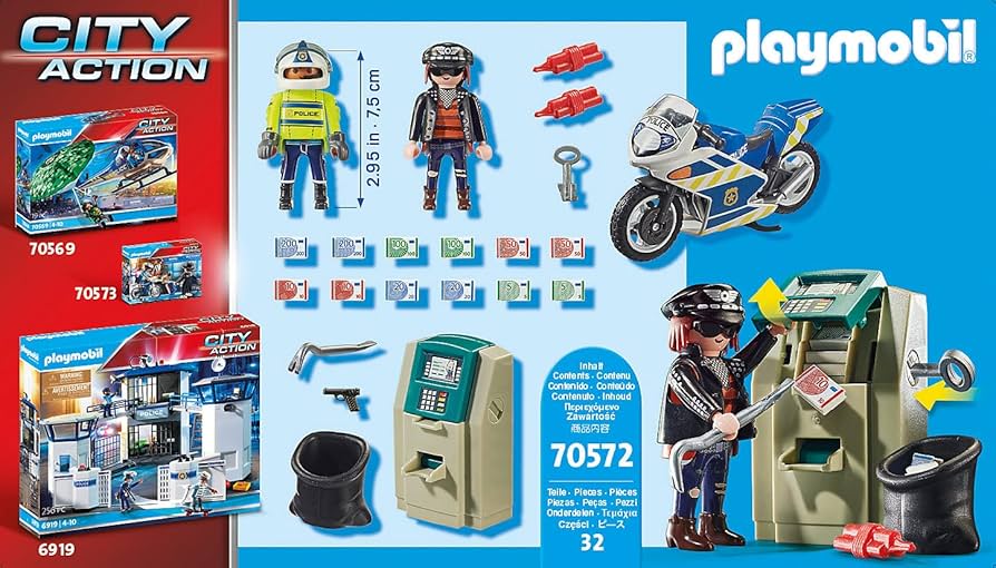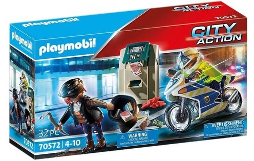 Under the cover of darkness, a pickpocket has broken into an ATM, now he flees with the prey. But a fast police officer has already taken up pursuit with his motorcycle. This thief will not get far! The playset contains two PLAYMOBIL figures, a motorcycle, an ATM, a crowbar, a sack, banknotes and many other extras.
