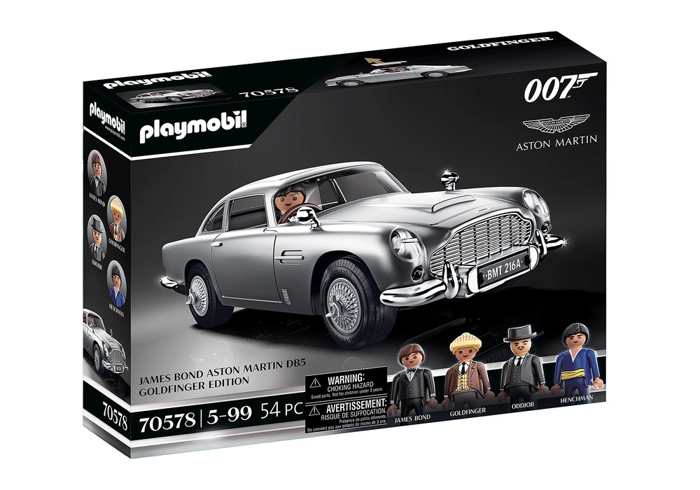 The name is Bond, James Bond and he's world's most famous secret agent. For nearly sixty years, the adventures of 007 have thrilled fans all over the world. Each new assignment is an action-packed adventure fuelled with amazing stunts, breathtaking car chases and, of course, all the latest gadgets. In his third on screen appearance in Goldfinger (1964), James Bond drives the iconic Aston Martin DB5 for the very first time. This silver Aston Martin comes with authentic gadgets including revolving number plates, a passenger ejector seat and much more. In this timeless vehicle, 007 out runs all of his pursuers in a spectacular chase and then thwarts the plans of villain Auric Goldfinger. This PLAYMOBIL set is a must-have for all Bond fans!